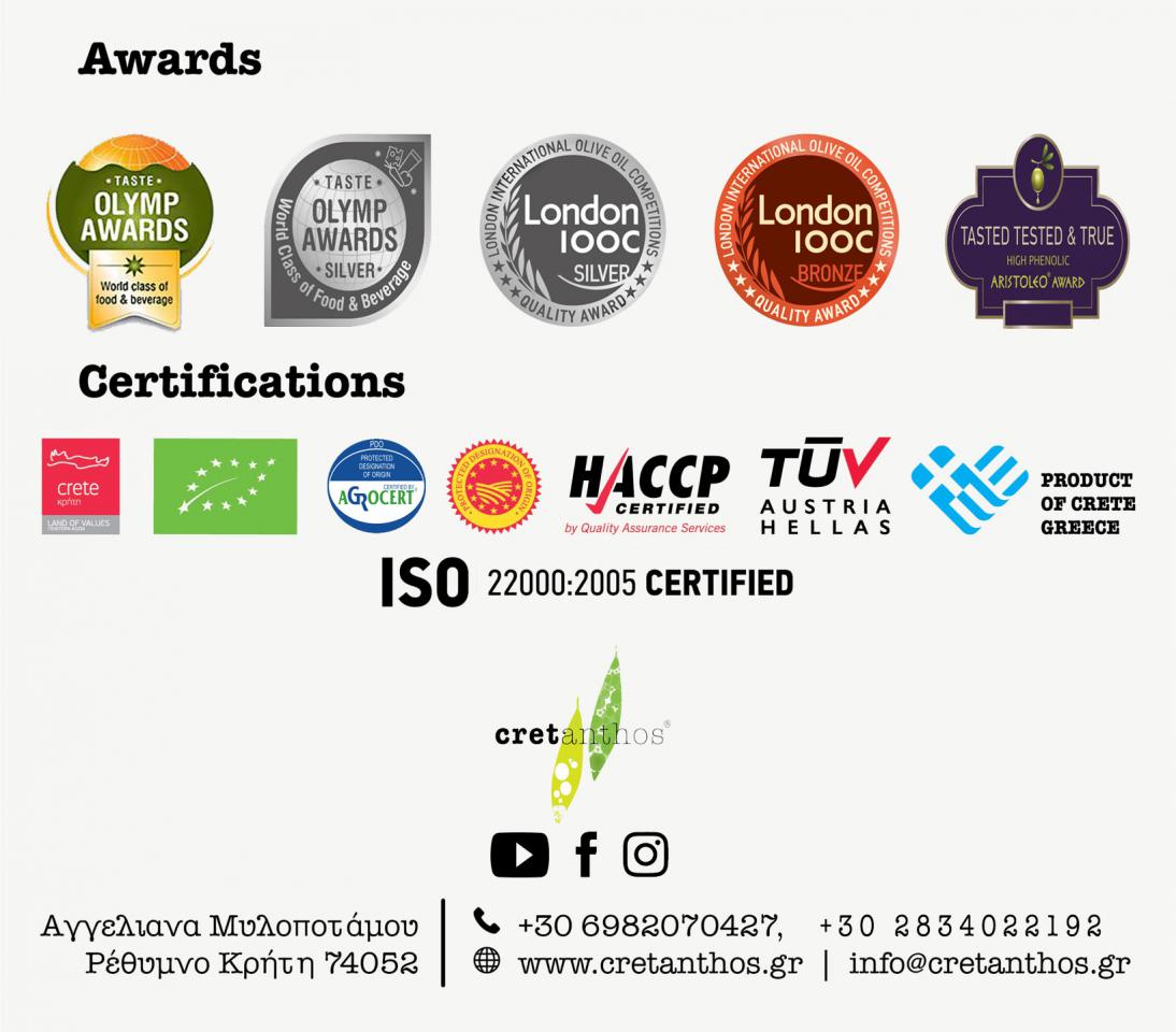 Cretanthos was founded in 2012 to offer the wealth of Cretan land to the final consumer! We have always been a family that we wanted to produce ourselves the pure products for our table. We have the same philosophy in our family business. We continue the work of our ancestors by using their knowledge and experience. We organically cultivate our four generations olive groves and we take care of giving to the final consumers a product of goodwill. Made with ''meraki'' and love, Cretanthos olive oil closes in its bottle a piece of Greek land's generosity!