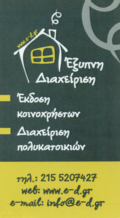Η ΕΞΥΠΝΗ ΔΙΑΧΕΙΡΙΣΗ είναι μια εταιρία εμπιστοσύνηςόπου το κύριο μέλημα της είναι οι αρμονικές σχέσεις μεταξύτων συνιδιοκτητών ή ενοίκων μιας πολυκατοικίας. Υπηρεσίες & Παροχές: